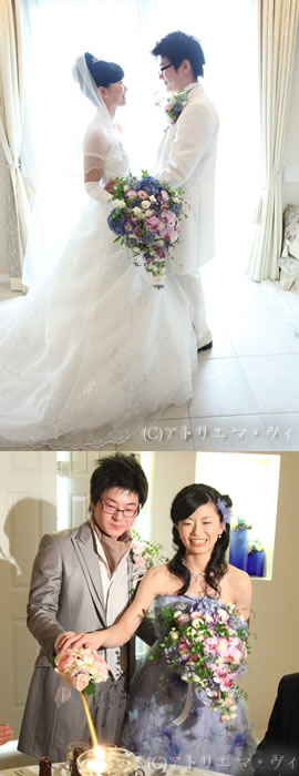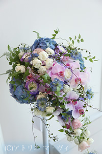 2つのドレスと 1つのブーケの出会い ― ブルーのあじさい、ニゲラ、トルコキキョウ、バラ 色ドレスと同系色の花に 上品で愛らしい胡蝶蘭と キュートな ウィットという名のバラを使い 2つのドレスのためのブーケが仕上がりました。